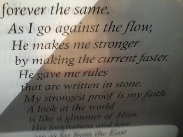 Going against the flow. Pushing like a seed against the dirt. Breaking through the cocoon. Bursting from the womb. Doing what is right when others think it seems so wrong. As I was at a local overnight lock-in for teens, I found this wall of tribute to a young man who died at the age of 16. Not sure if it was cancer, but it seemed as though he played against the current and left behind some fruitfulness. As I was reading the Psalm he had written before he died, part of it just caught me and swept me away for a moment. “As I go against the flow, He makes me stronger”, those words just drenched me the moment I read them. I wish I had taken the time to take a picture of the whole psalm written by this teenager, but the glare from the lights made it difficult. Yet, I think I only needed that small part for his presence in this world to make a difference in me.