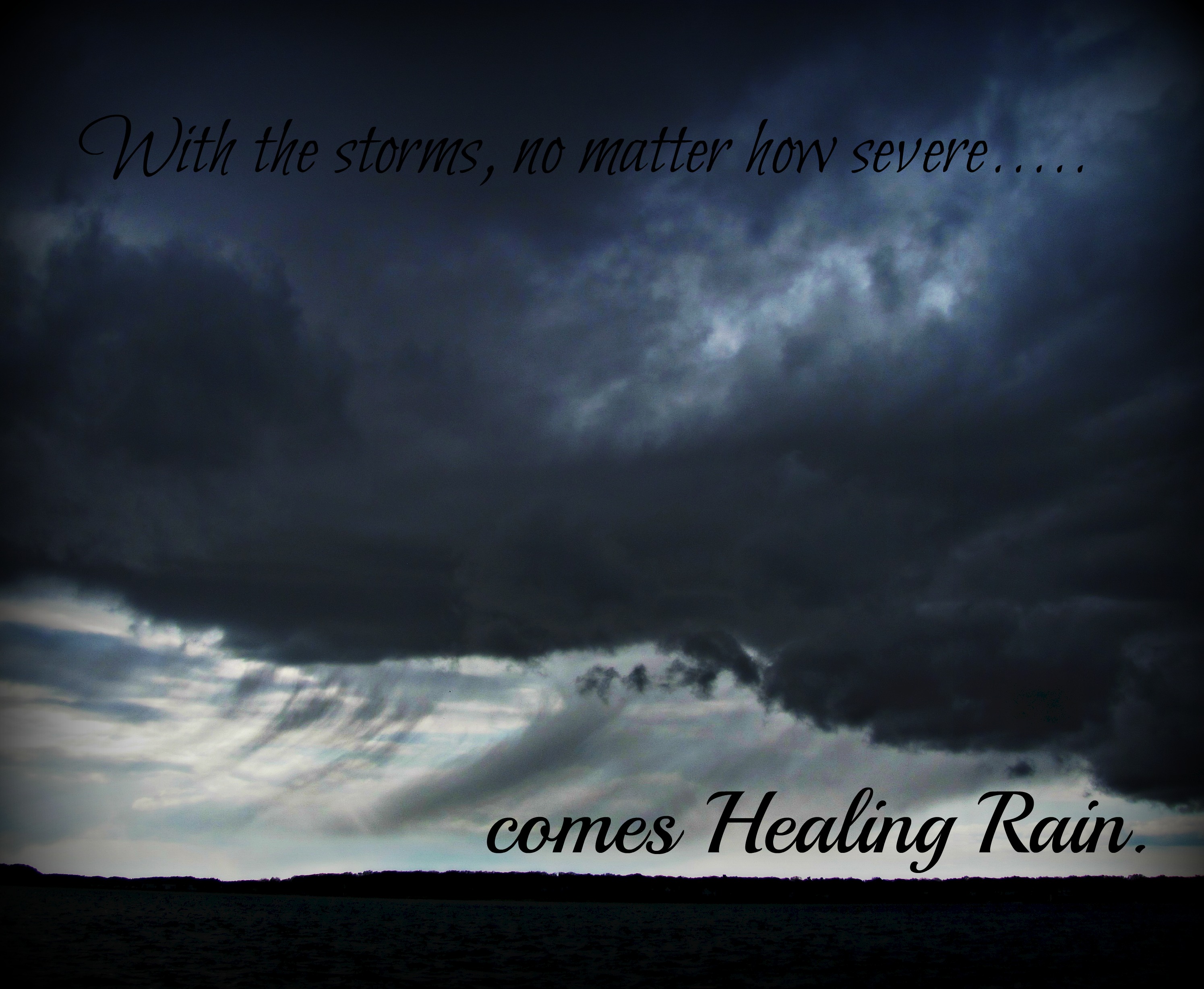 I look back now on all of the storms in my life and I can see them for what they actually were, character building, healing rains. Every storm has something to glean from it. Every storm brought me closer and closer to who I am in Christ today and I am ever so thankful for the rain. The rain provided drops of healing for my broken heart. It was the rain that held me together. Now I see the storm and my feet want to dance in the rain instead of hide from it.