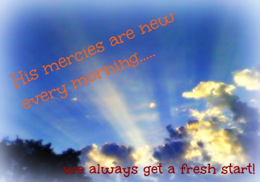 Each new day means a fresh start at what ever was going on yesterday. Maybe we really made some bad choices concerning our lives and instead of dwelling on the what ifs or the how comes, we should choose to change our thinking and embrace the new day as a chance to do it again the right way. Take a moment and just ask God what you can do differently today to make a change for the better.
