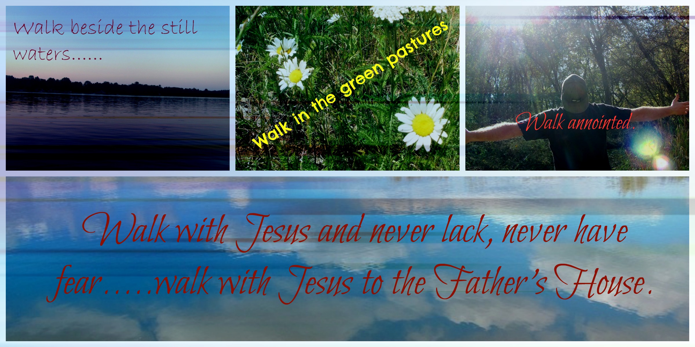 I am your Shepard, because of Me you will NOT lack. Walk with Me and see the green pastures. Walk with Me and let Me show you the still and restful waters. Walk with Me and I will refresh and restore you. Walk with Me in righteousness to honor My Father. Yes WE will walk through valleys of death but walk with Me and there will be no fear. I will protect you and give you comfort. Walk with Me to the table that has been set before you with your enemies. Walk with Me and I will anoint you with oil until your cup overflows. Walk with Me and you will only find goodness and mercy and unfailing love forever. Walk with Me to your dwelling place, My Fathers House.