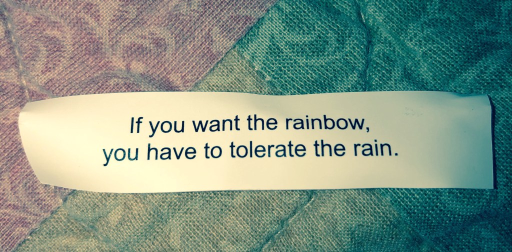 So today I find this random fortune cookie while preparing my frozen food for microwaving. As I crushed the cookie to find the hidden message I felt tears falling as I read the message, “If you want the rainbow you have to tolerate the rain.” Now I’m not one to take what a fortune cookie says to the bank but this one spoke to me.
